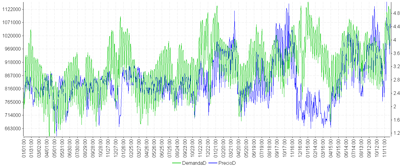 // demanda eléctrica y de precios de la electricidad en fechados, TimeSet,